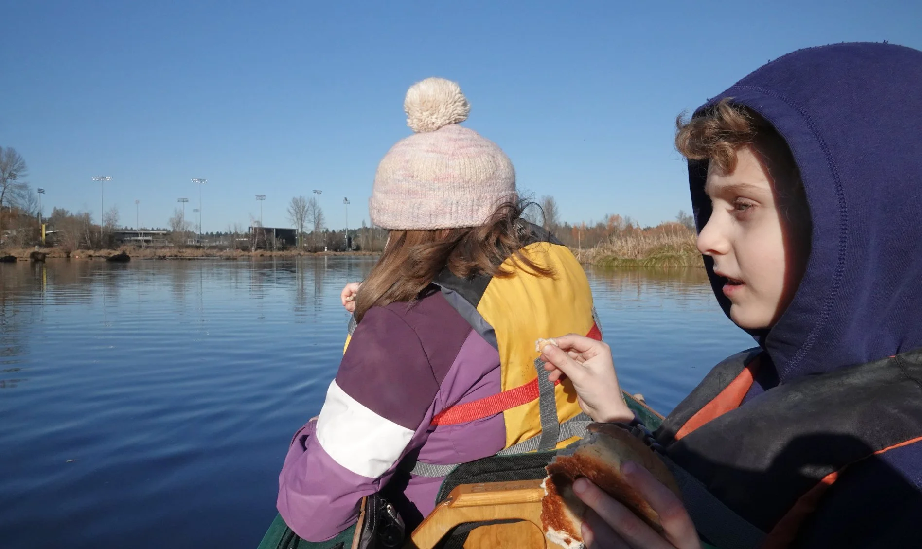 Leon and Alex approaching arboretum landing beach. When Leon grew a little fussy, I removed his life jacket to cheer him up.