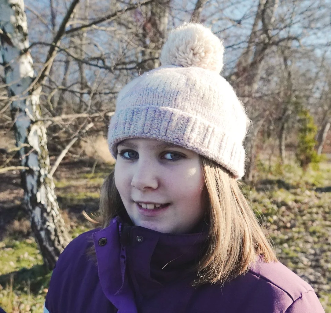 Maya in sunglasses, sun hat, waterproof shoes.