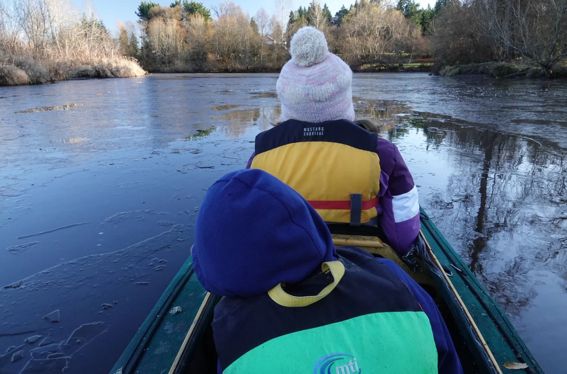 Maya breaking ice at Seattle Arboretum. The kids helpfully stomped the ice at the beach to create open water for our launch.