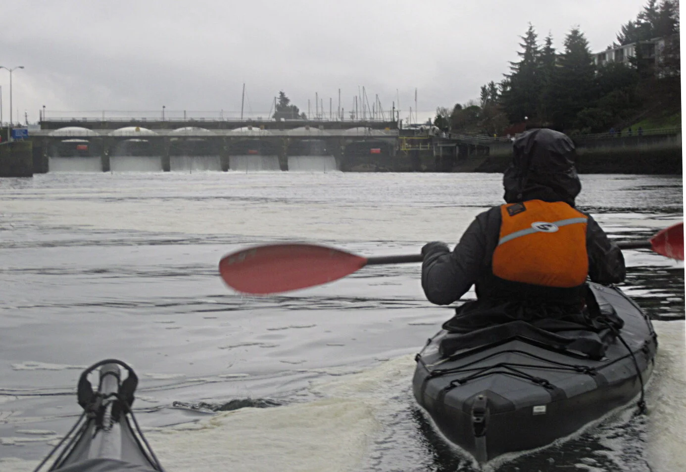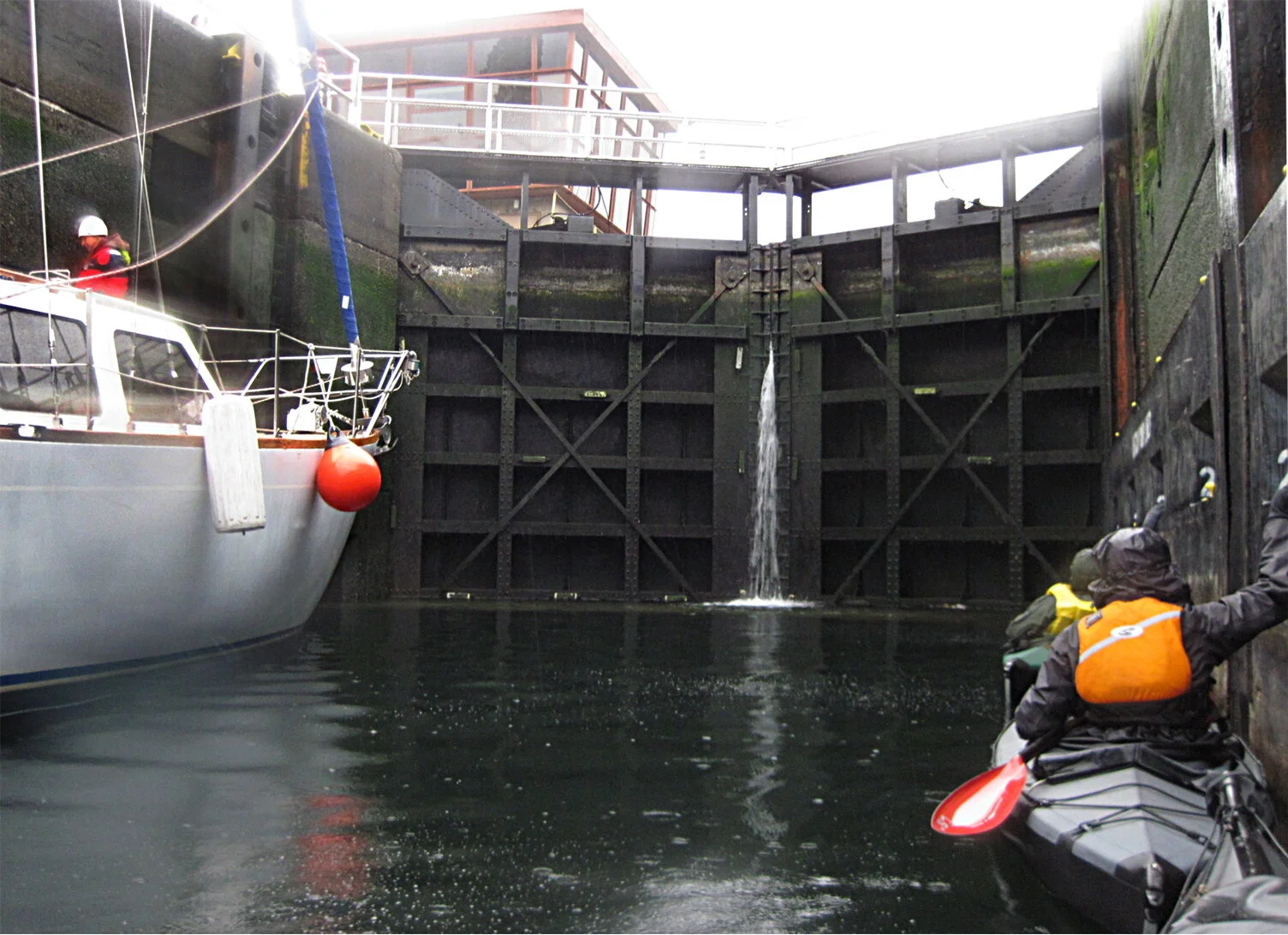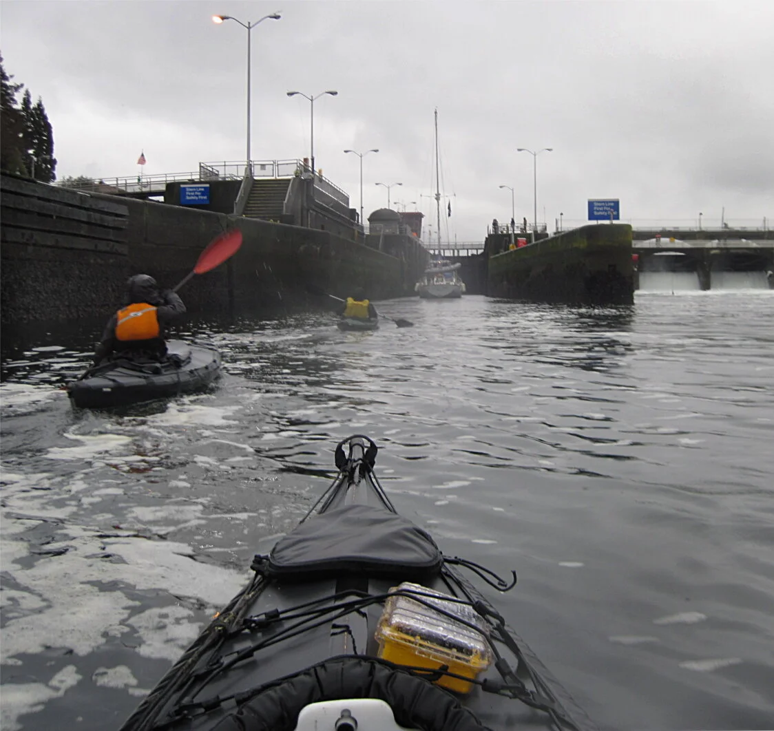 My girlfriend Rachel, my dad, and I paddled through the Ballard locks here in Seattle in February. It was such a cold, rainy day that even the heavily Gore-texed crew of a sailboat that locked through with us leaned over to say, “Wow, you guys are hardcore!”