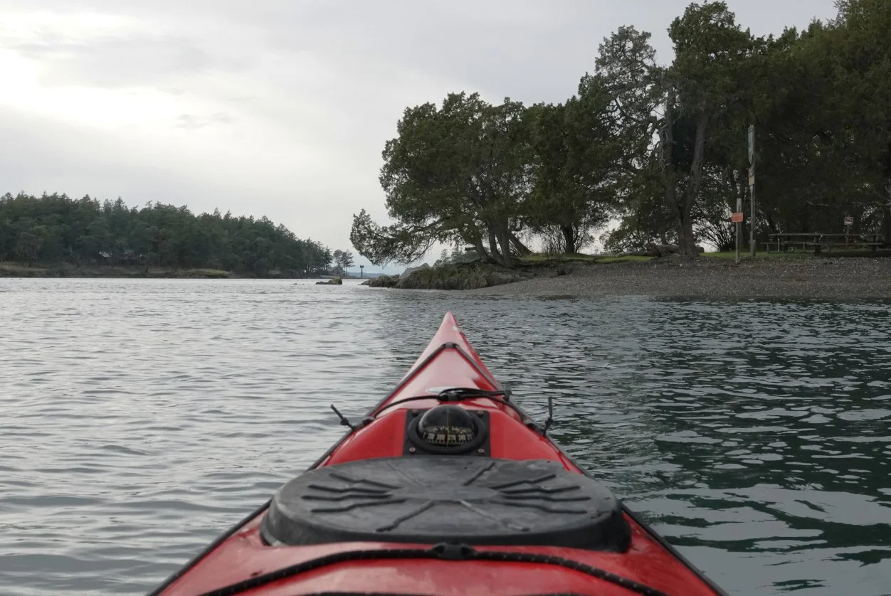 Arriving by kayak to Posey Island. Posey Island is the most easily accessible of any of the kayak-campgrounds in the San Juans, suitable for paddlers of any ability, including families with children.