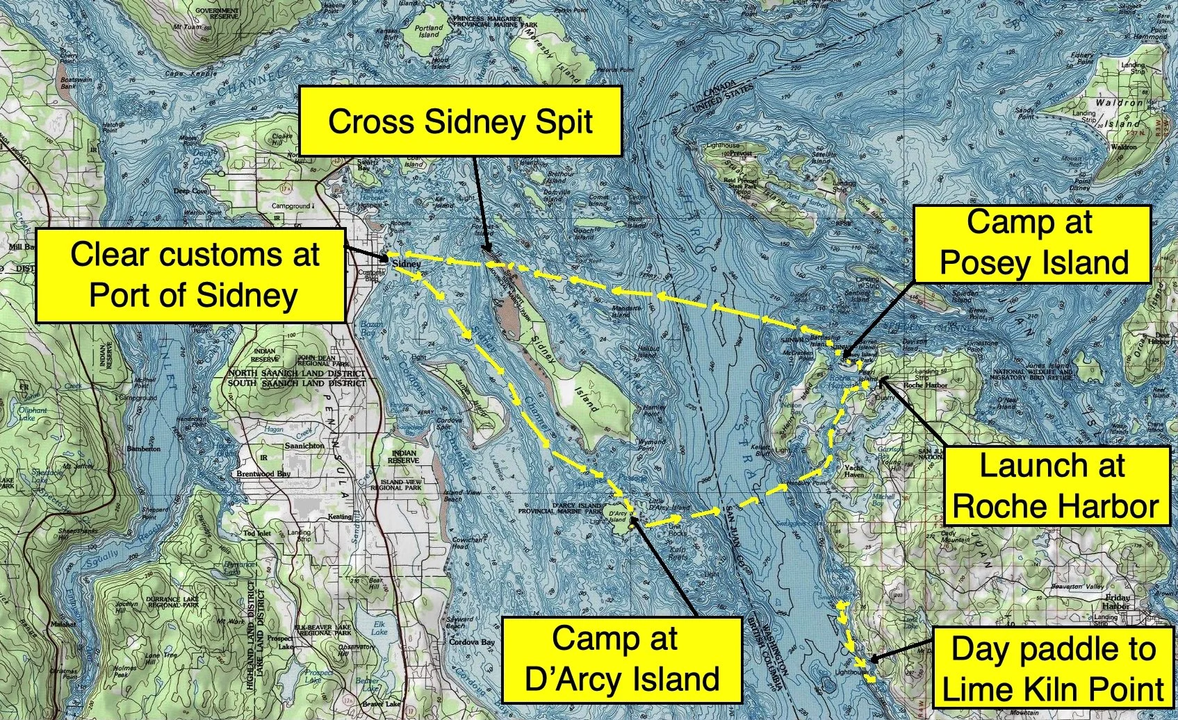 Friday night, I staged myself on Posey Island for the next day’s paddle across Haro Strait into BC. My route was constrained by the requirement to check in with the Canadian customs office. Unlike US customs, which has transitioned to an app-based system for the clearance of boats, Canadian customs still requires boaters to present themselves at one of several fixed locations for clearance, even though the clearance itself occurs over the phone. The closest telephone reporting site was in the port of Sidney, so that is where I must head before touching land anywhere in Canada.