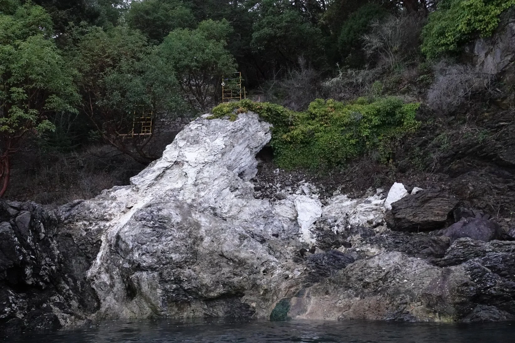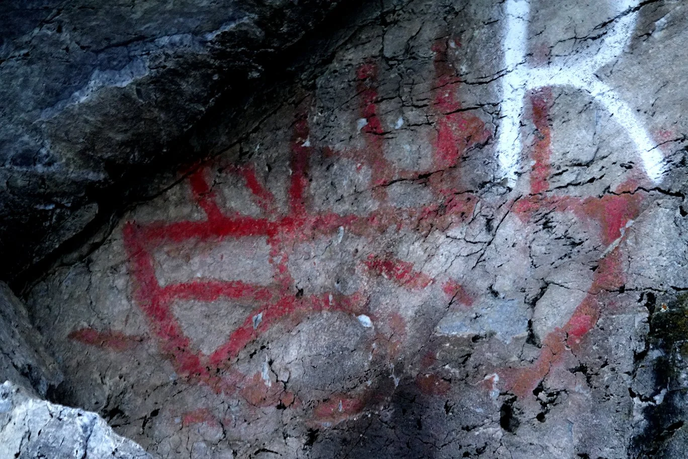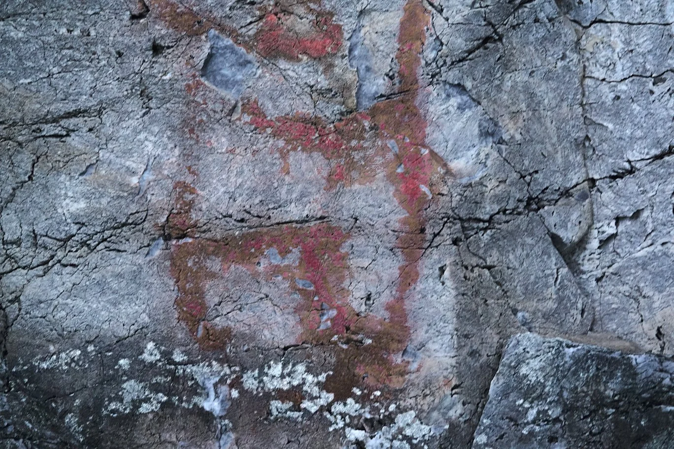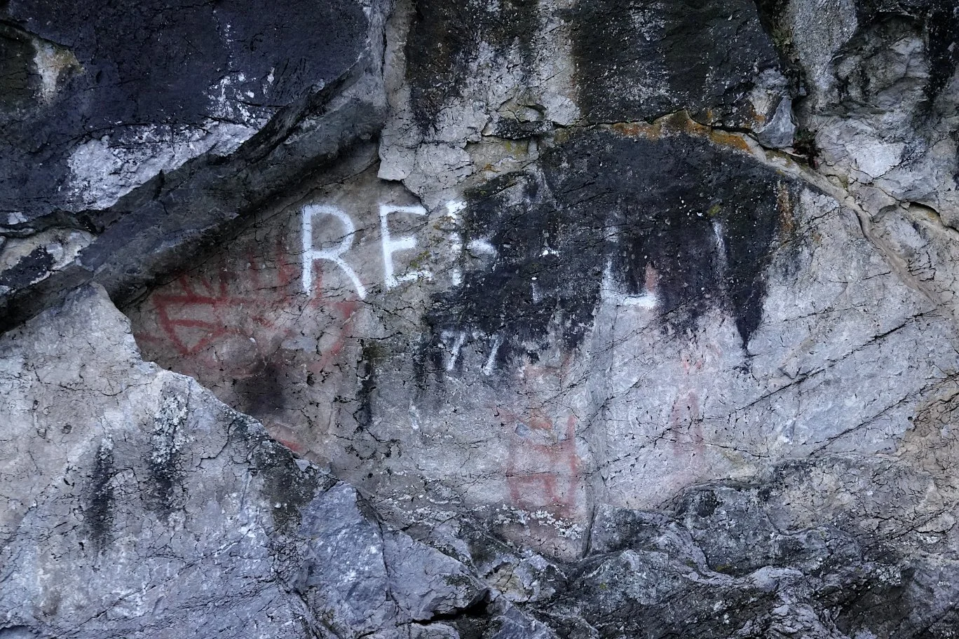 Then I saw it, just south of the historic lime works and visible from a hundred meters offshore: “REBEL 77” in bright white paint. Protected by a shallow overhang, this piece of vandalism had endured for nearly half a century and was now beckoning me toward the pictograph, which was much harder to discern than the spray paint was.