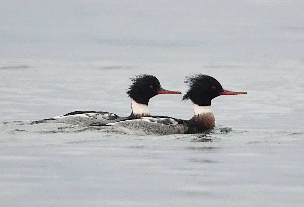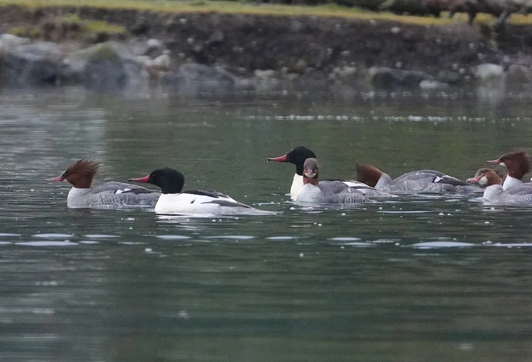 Red-breasted mergansers, Sidney Channel. This species was the most abundant of the sea ducks, present in rafts of ten to fifty throughout the islands.