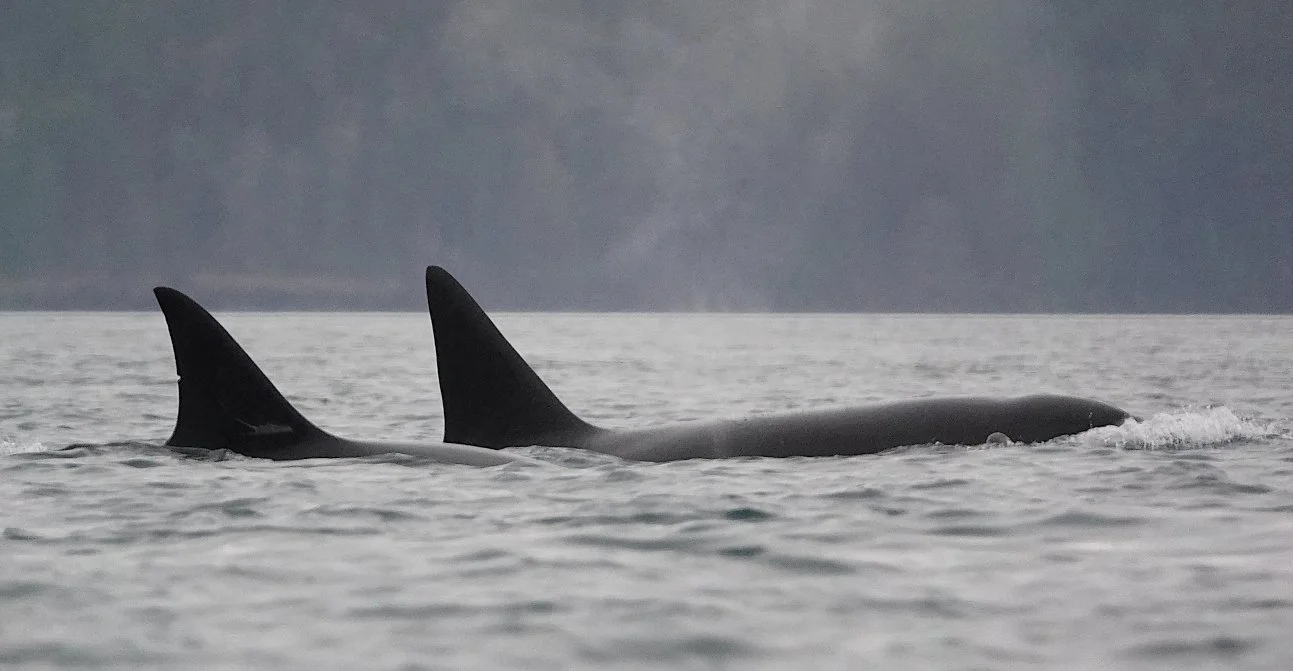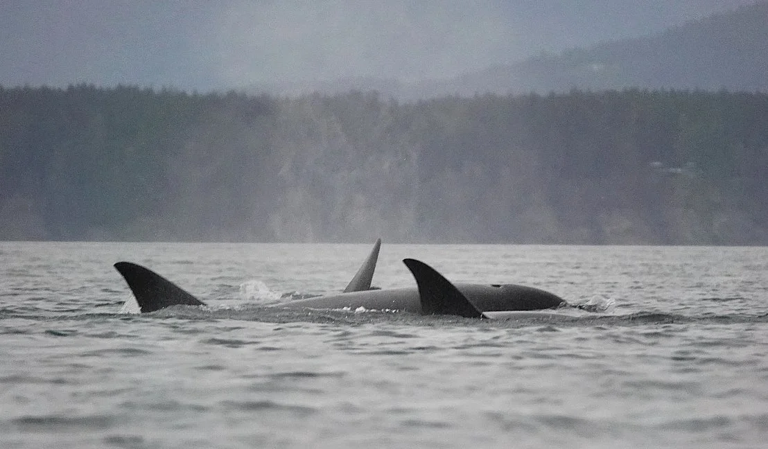 Pair of orcas, Haro Strait. I mistook the first spout for a possible humpback whale, but then a series of spouts and dorsal fins confirmed the presence of orcas.