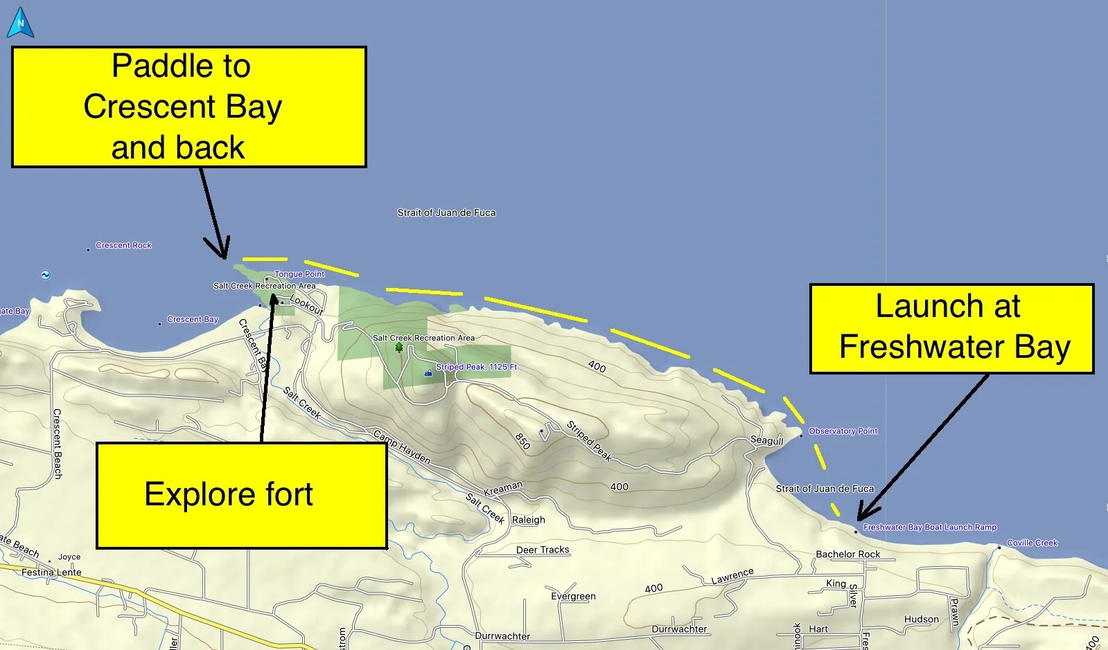 In preparation for a big trip across the Strait of Juan de Fuca to Race Rocks, I drove out to the Olympic Peninsula the day before to scout launching locations. I checked out Ediz Hook, Freshwater Bay, and Angeles Point, ultimately settling on Angeles Point as a reasonable compromise between swell exposure and paddling distance.