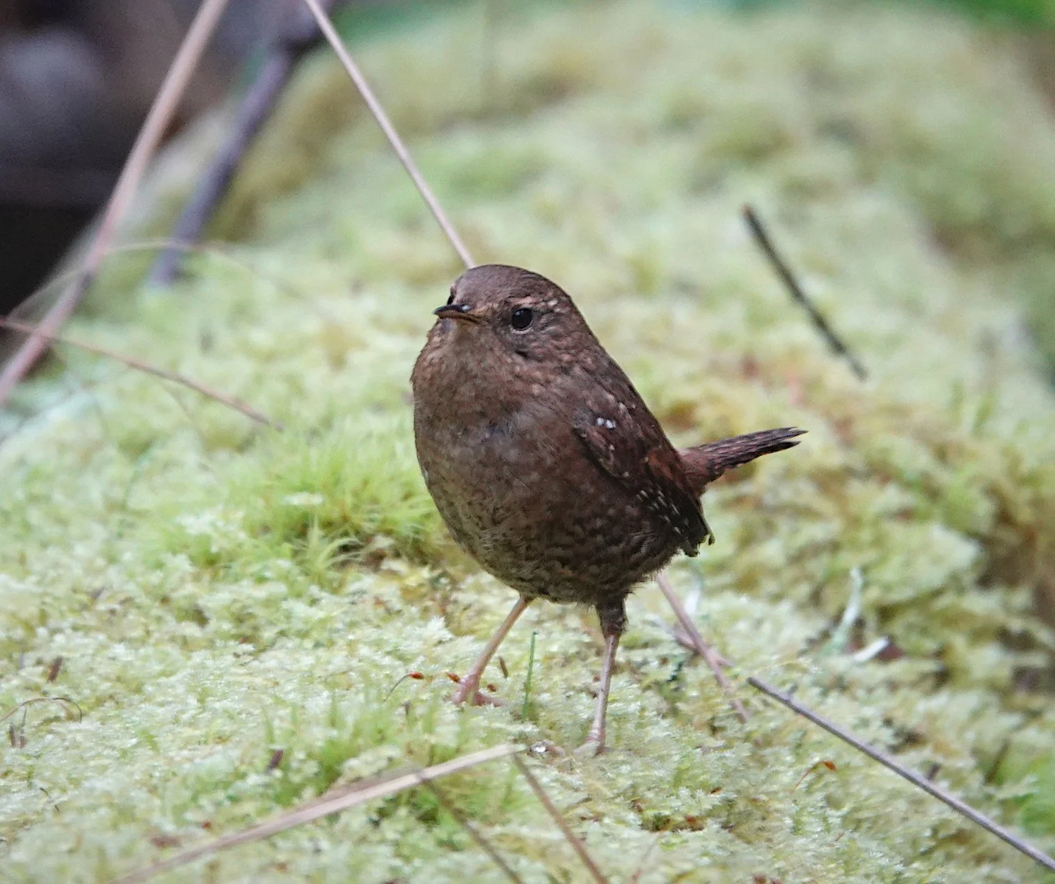 Pacific wren, Hope Island. This individual skulked around in the bushes for a few minutes then flew up onto a low snag and burst into song.
