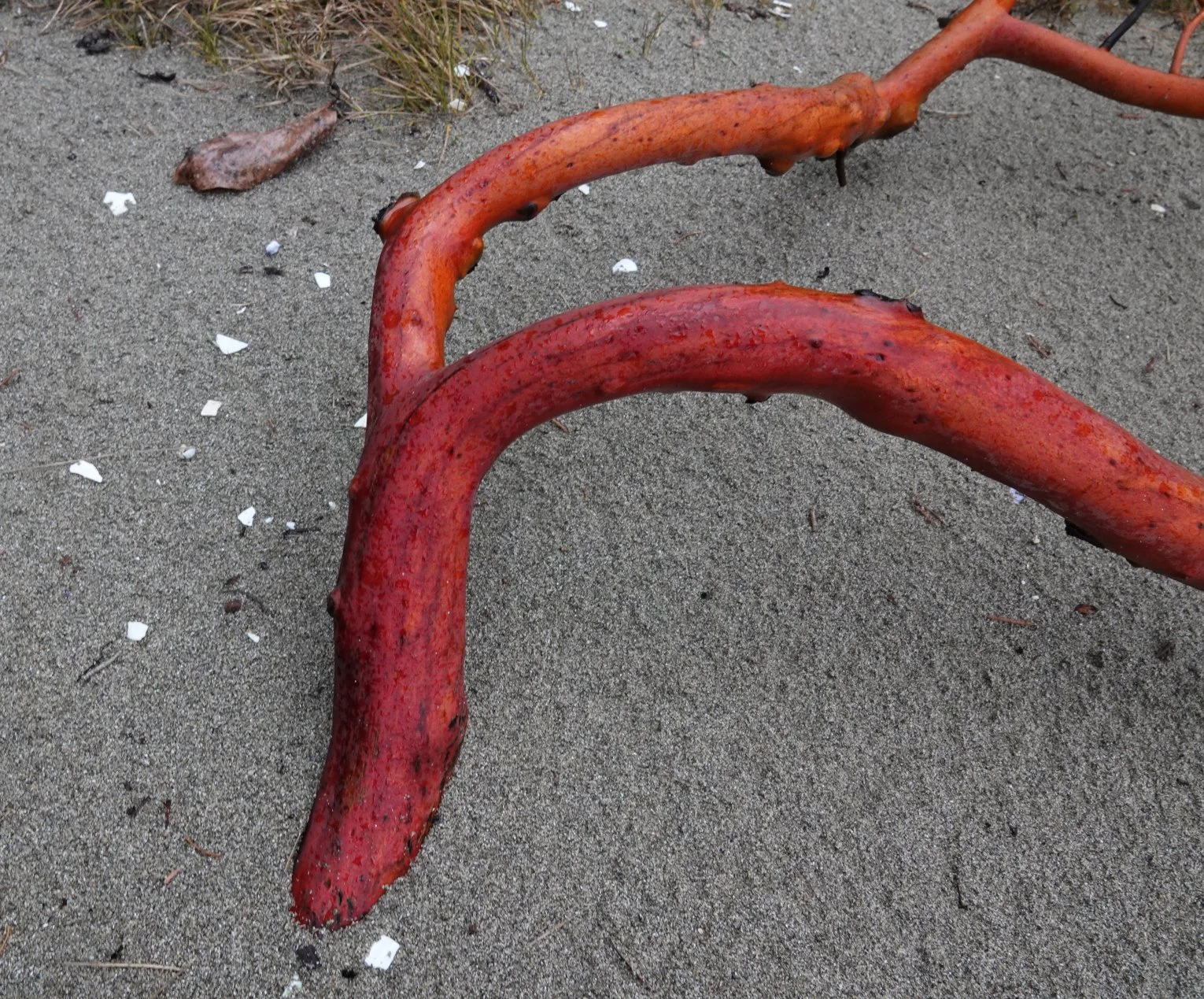 Branch of Pacific madrone, buried in sand. The bark of this species turns all different shades of green and red, depending on the tree’s age and health.