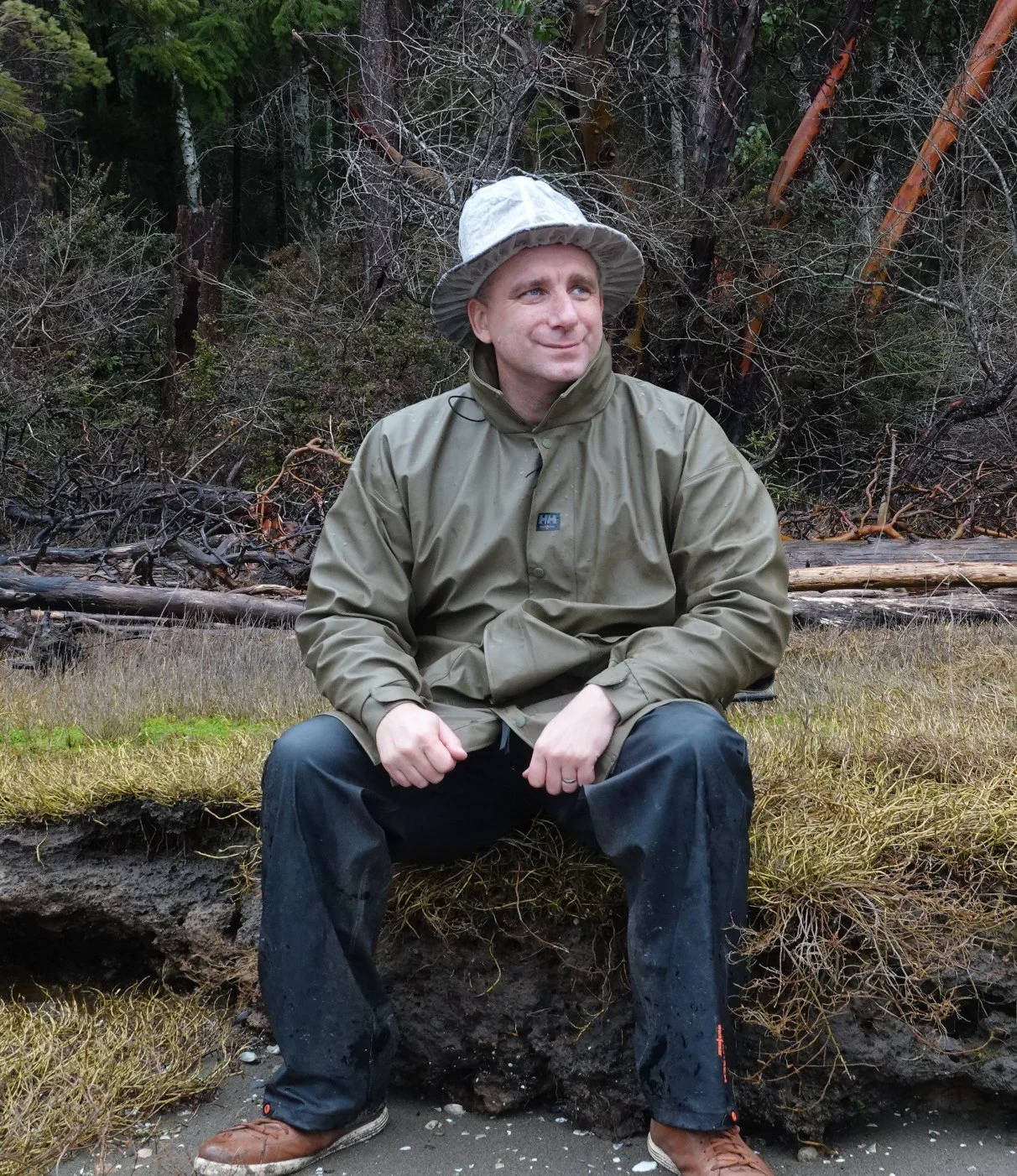 Sitting on mud bank, Hope Island. I had forgotten to bring a tarp or waterproof hiking boots, but fortunately the rain subsided over the course of the day.