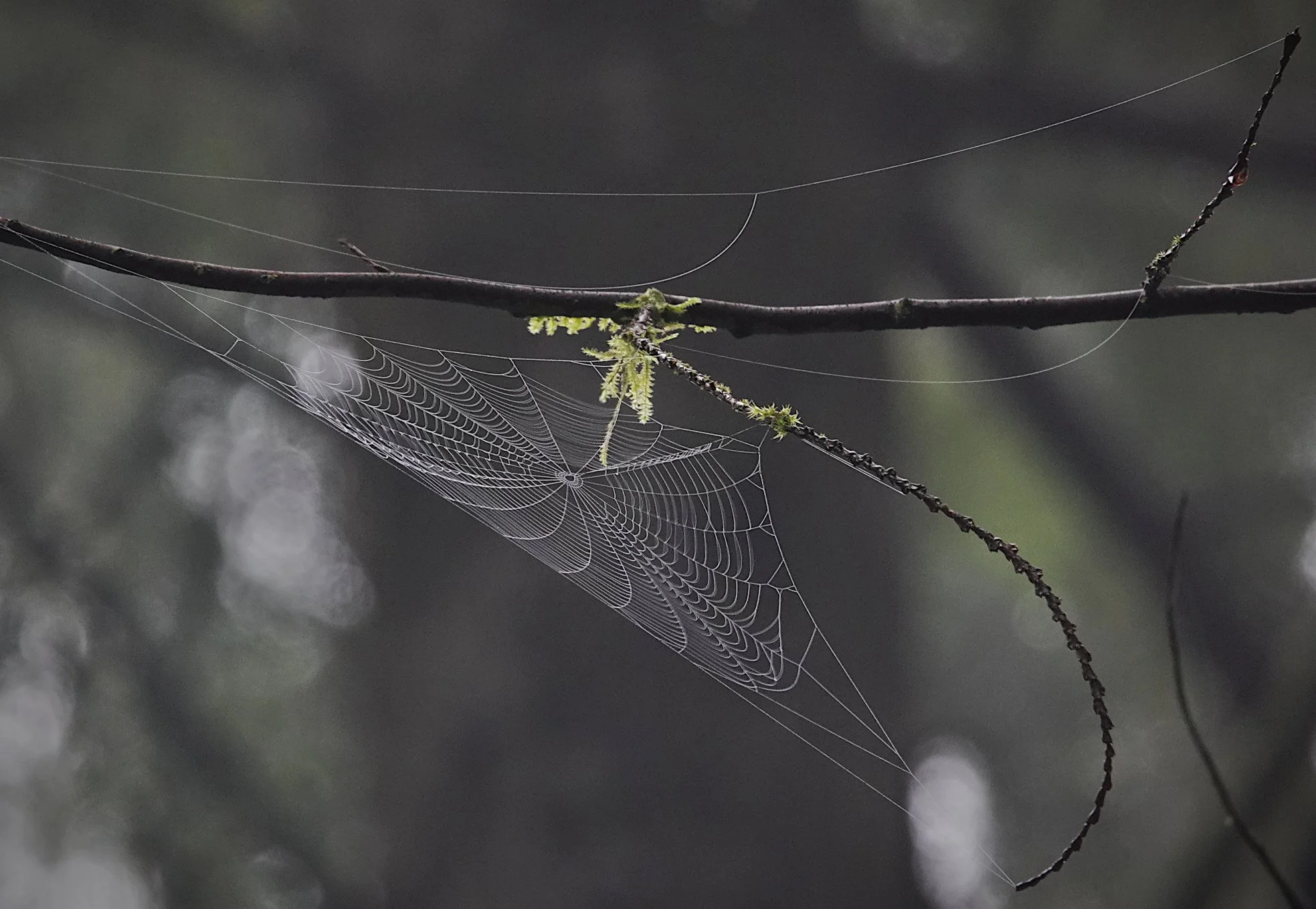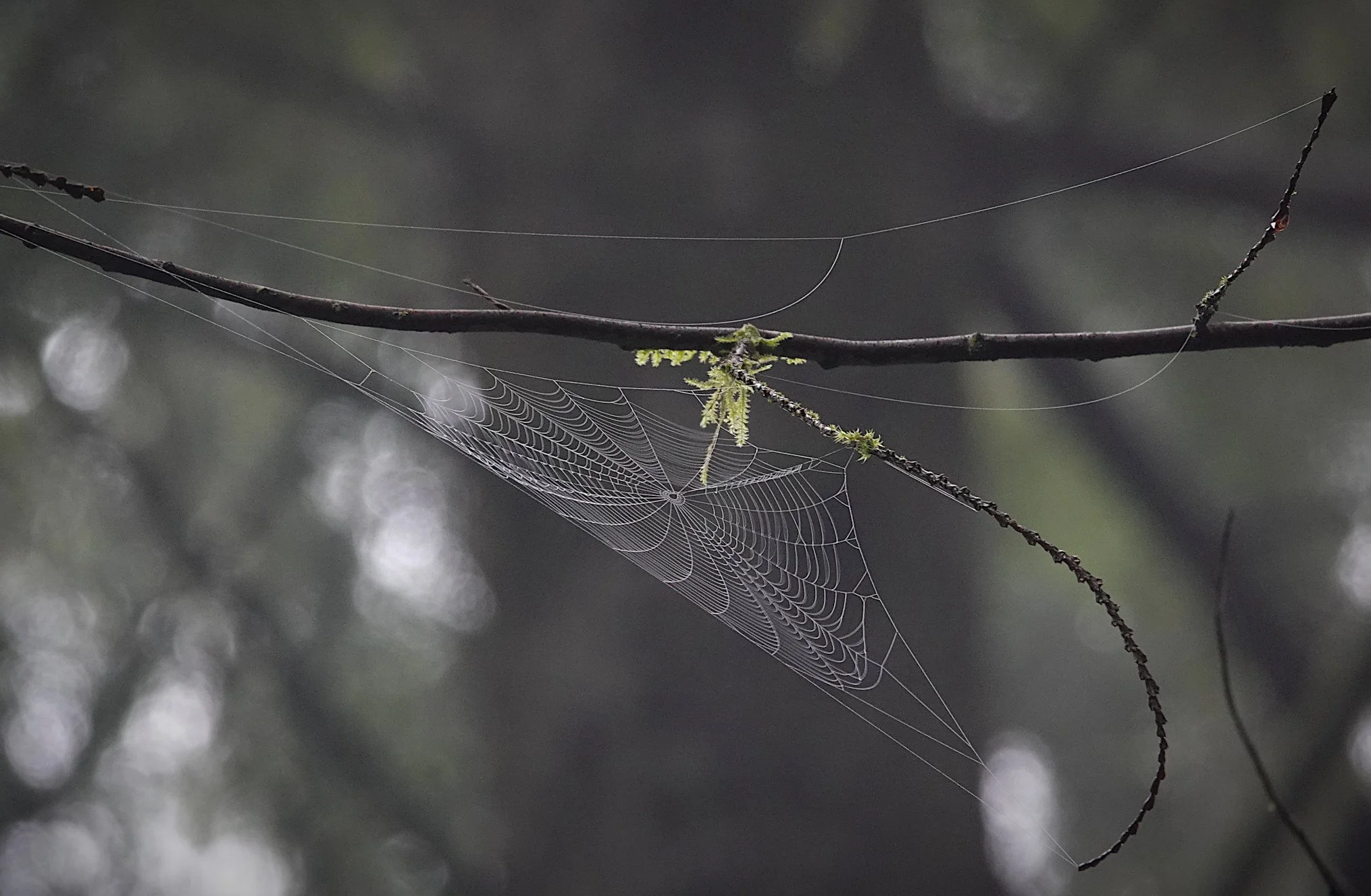 Spiderweb high in trees. Birds and spiders alike were at work in the forest, hunting for newly hatched insects.