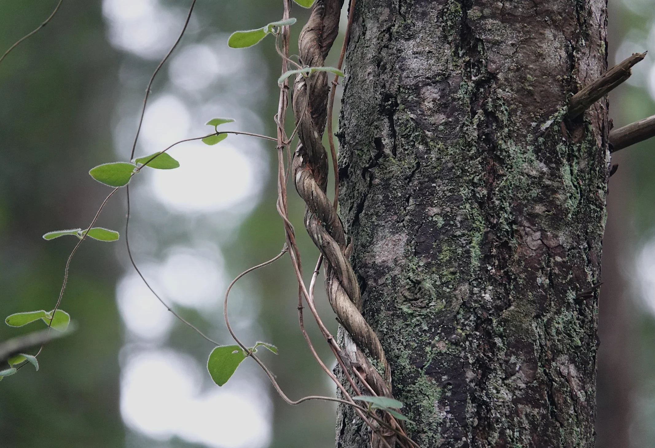 “Island Belle” grapevine growing up trunk of Douglas-fir. Grapes planted by settlers in the 1890s have gone feral, struggling to hold their own against the encroaching forest.