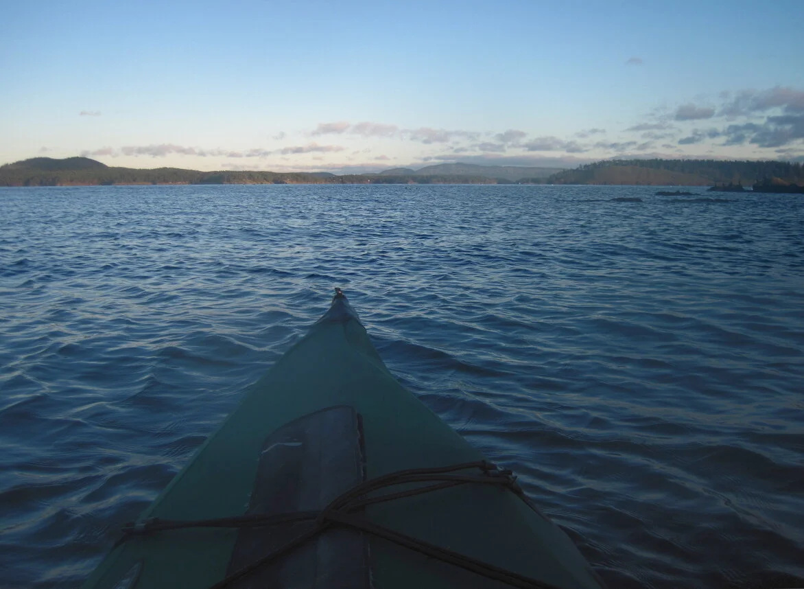 Kayaking north up Haro Strait to Stuart Island. In the morning, the wind had died down, and I had an easy crossing to Stuart Island.