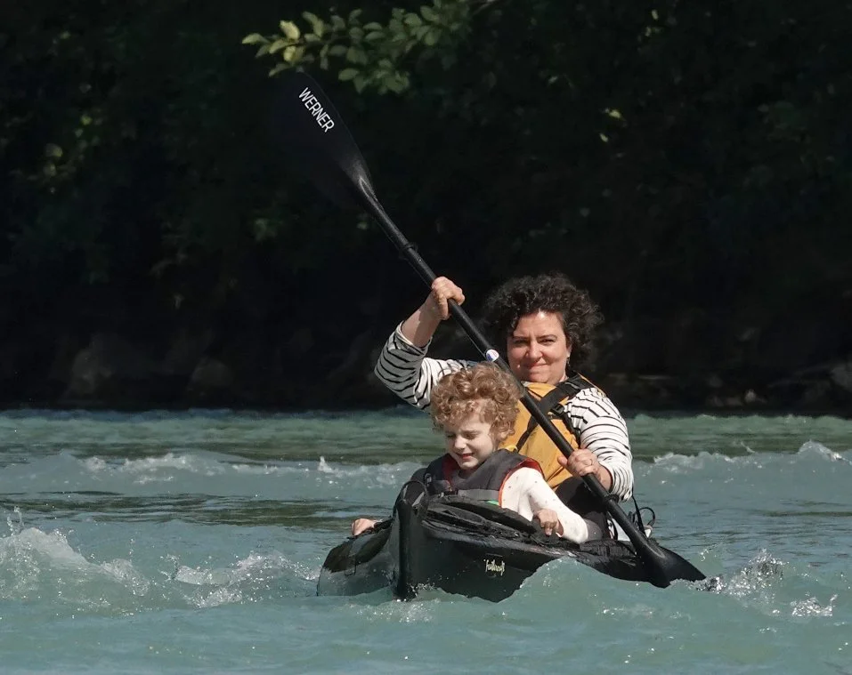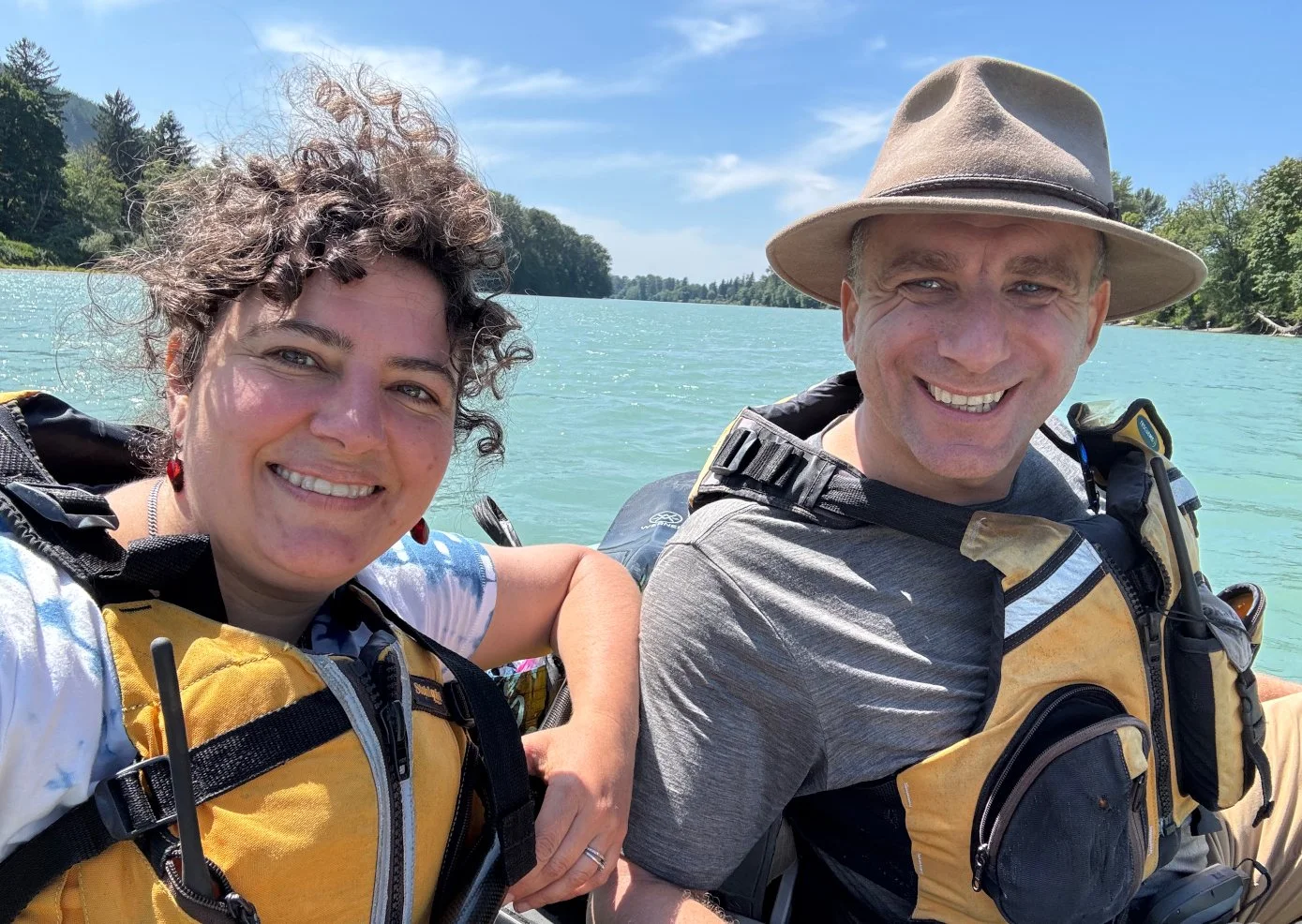 Rachel and Maya kayaking down Skagit River. These lower reaches are not the federally designated “wild and scenic” portion of the Skagit River, but they were still scenic enough for us.