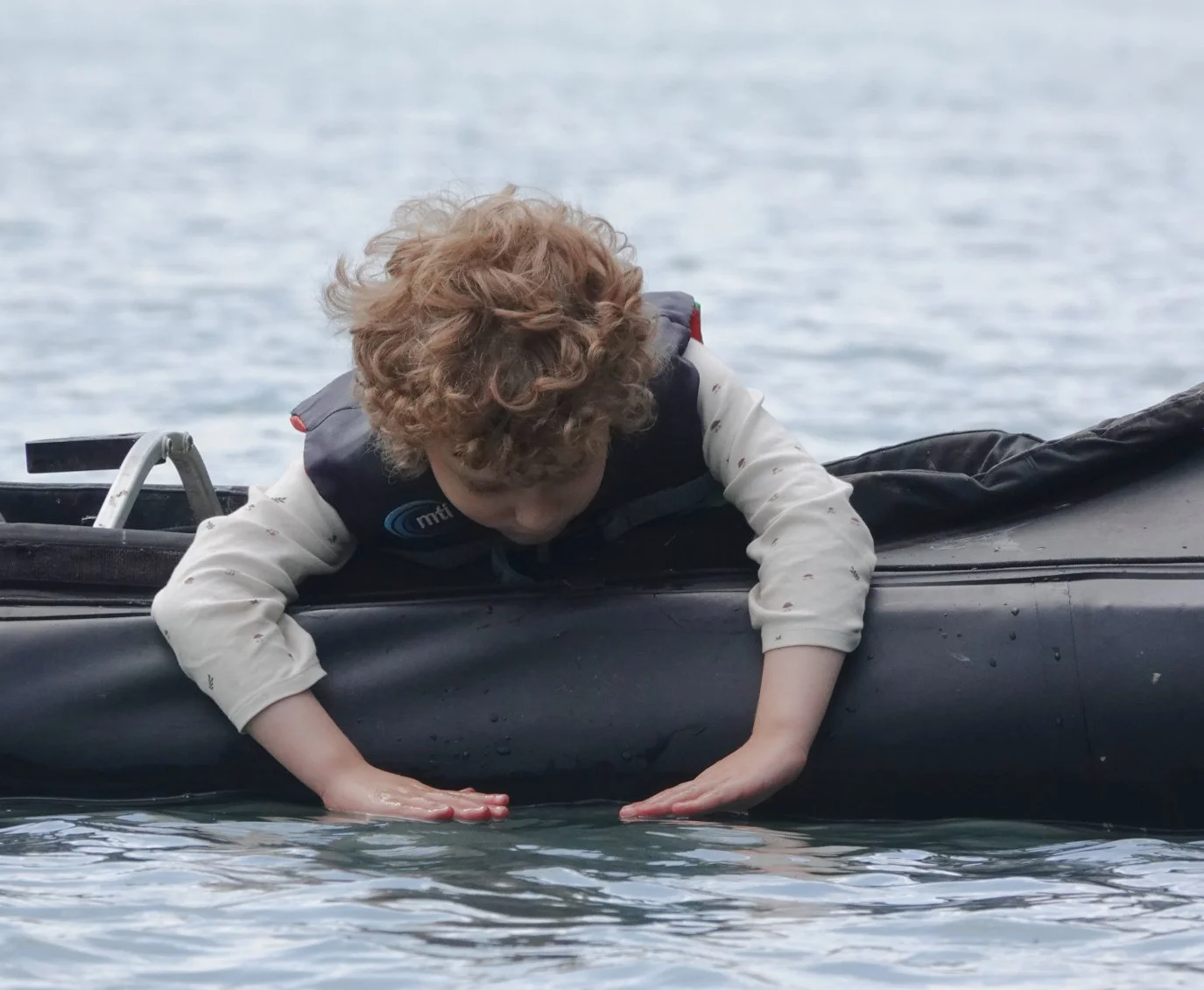 Leon dipping hands in river. In the middle of July, the water was chilly but not icy.