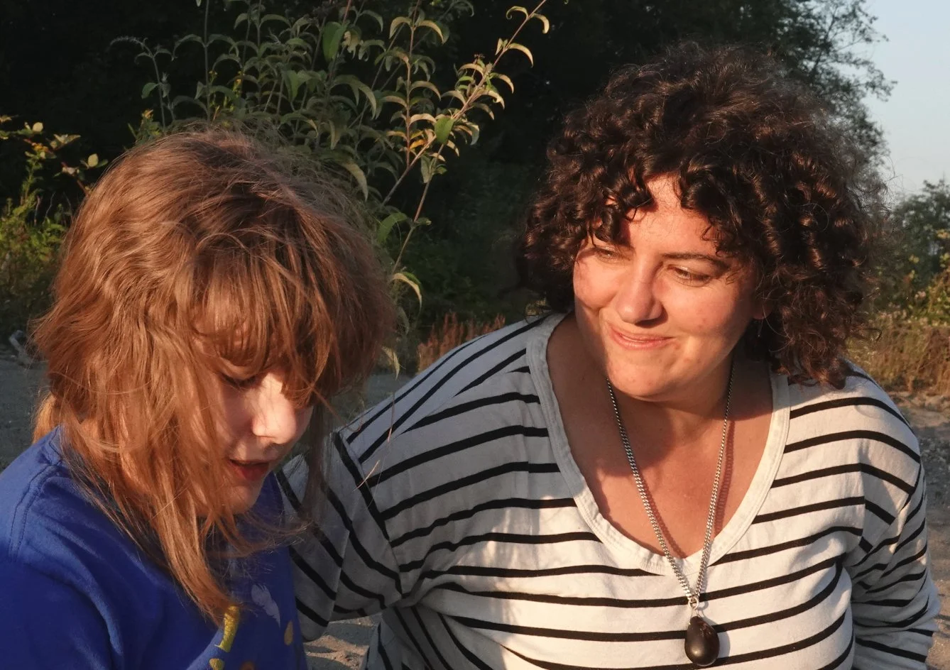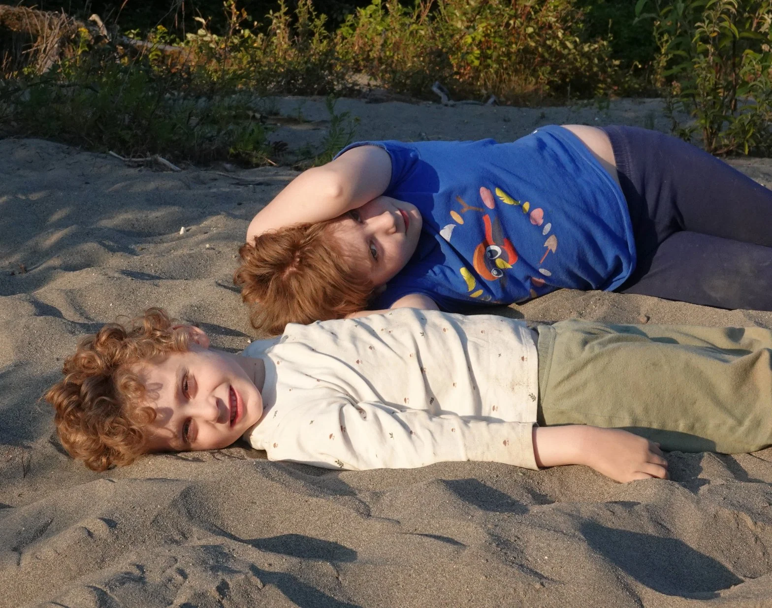 Leon and Maya lying in sand. In some places, the sand was so soft we could have slept on it without sleeping pads.