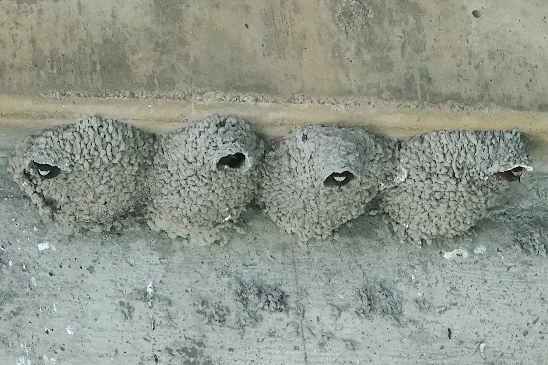 Cliff swallow nests beneath Highway 9 bridge over Skagit River. Each nest is painstakingly constructed of mud, one tiny dab at a time.