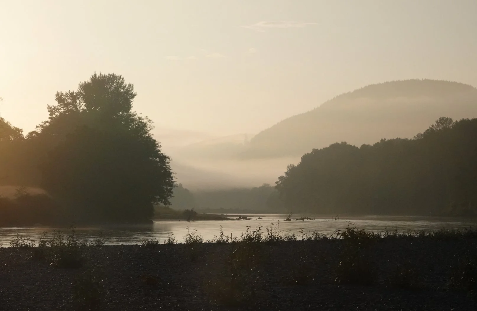 Dawn on Skagit River. Even in July, condensation formed overnight on our tent and gear.