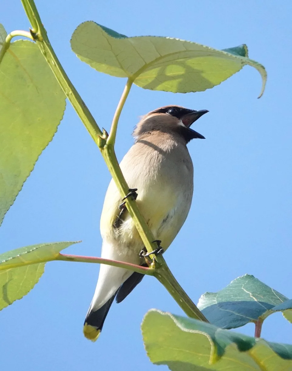 Cedar waxwing near Burlington. Waxwings eat berries and insects.