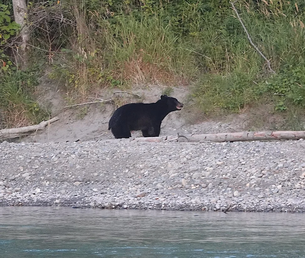 Shortly before sunset one evening, Rachel and I were sitting in camp joking about something or other, when she said, “There’s a bear, a black bear.” I thought at first this was part of the joke, but when I looked behind me, sure enough, there was a bear on the far side of the river. It was missing one of its front paws, perhaps the result of a car collision or possibly even a trap. We called the kids from their games on the beach so they could see their first-ever wild bear.