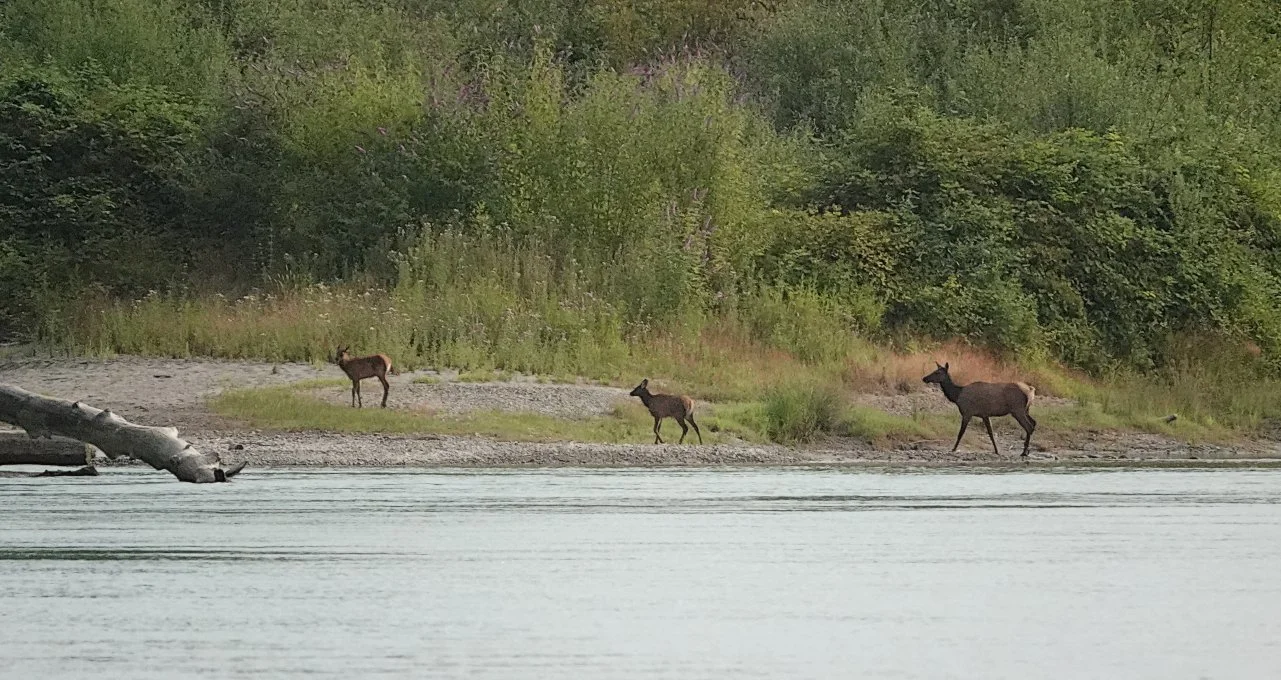 Elk crossing Skagit River. Once ashore, the elk disappeared immediately into the brush.