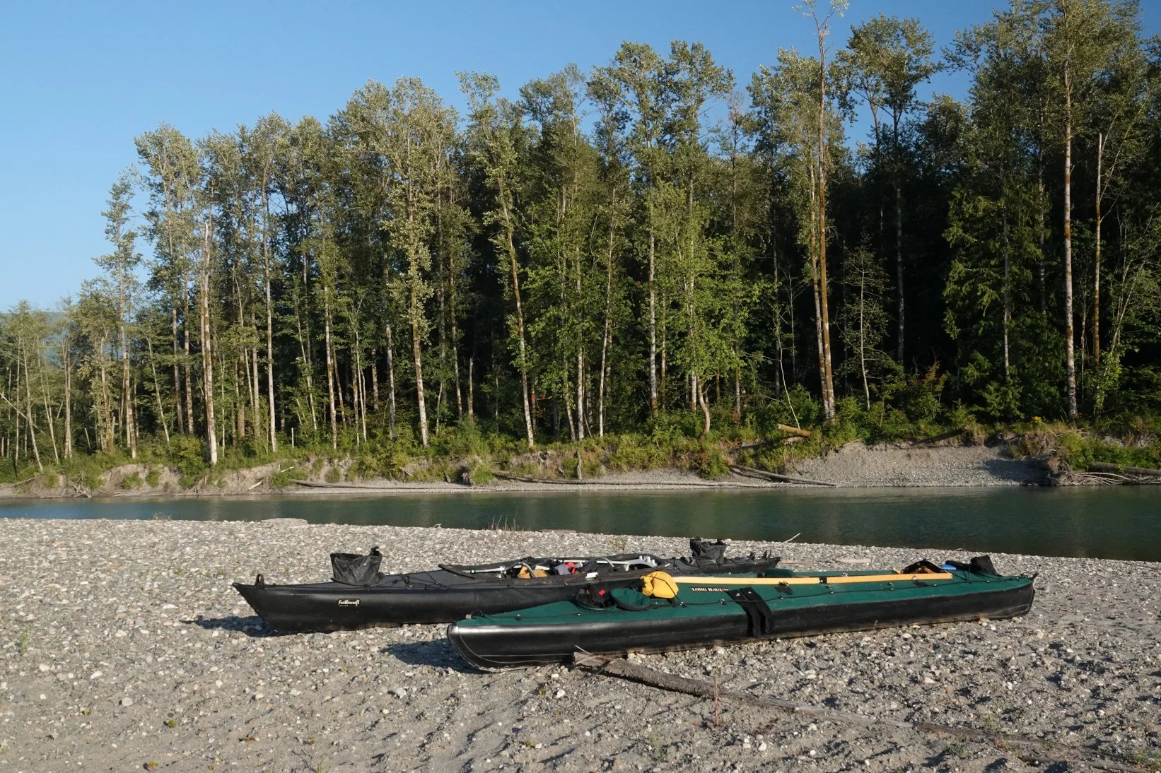 Kayaks on beach outside Minkler. Water levels in the Skagit River are controlled by the dams, so we hauled our boats dozens of meters up the beach each evening.